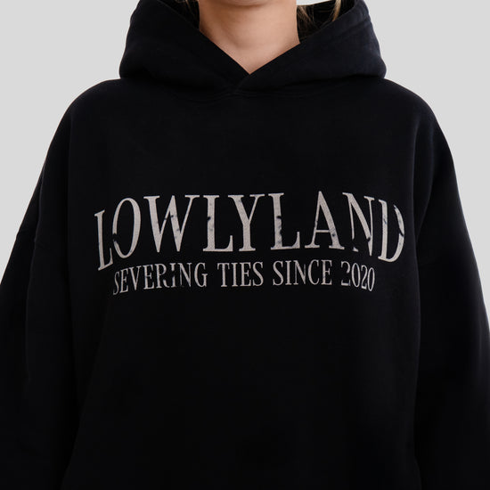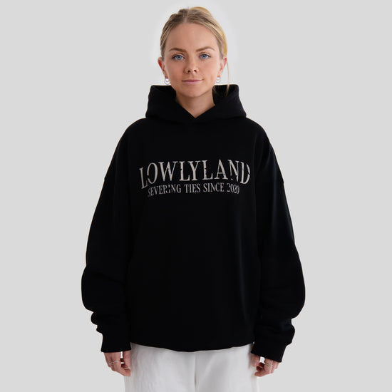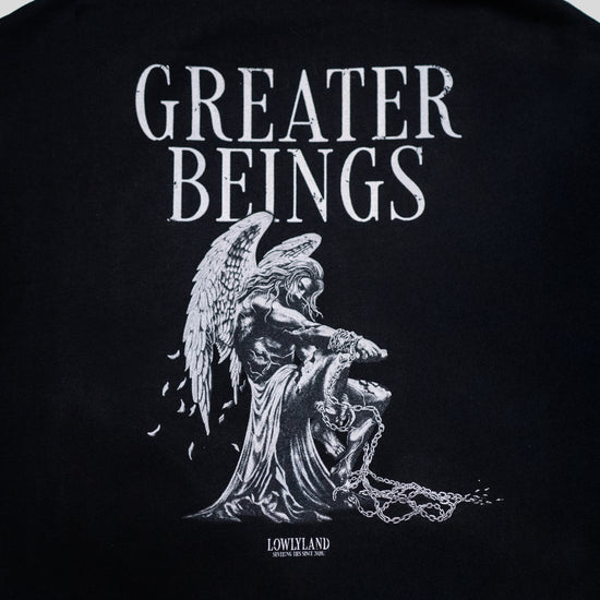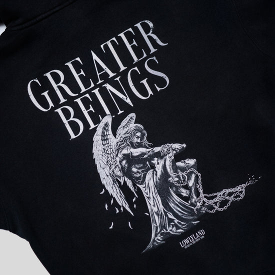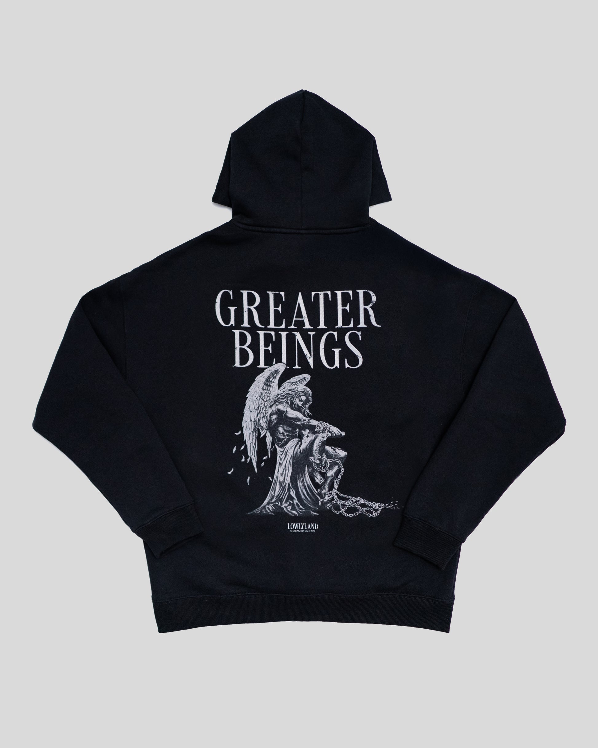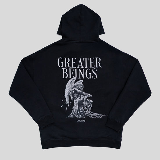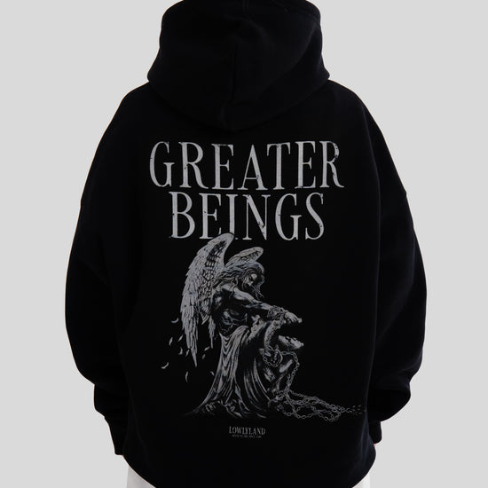 Introducing the Lowlyland 'Greater Beings' Hoodie in Jet Black & Charcoal.